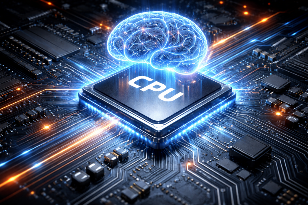 CPUとは、パソコンの頭脳にあたる部品です。情報処理の速さを左右します。