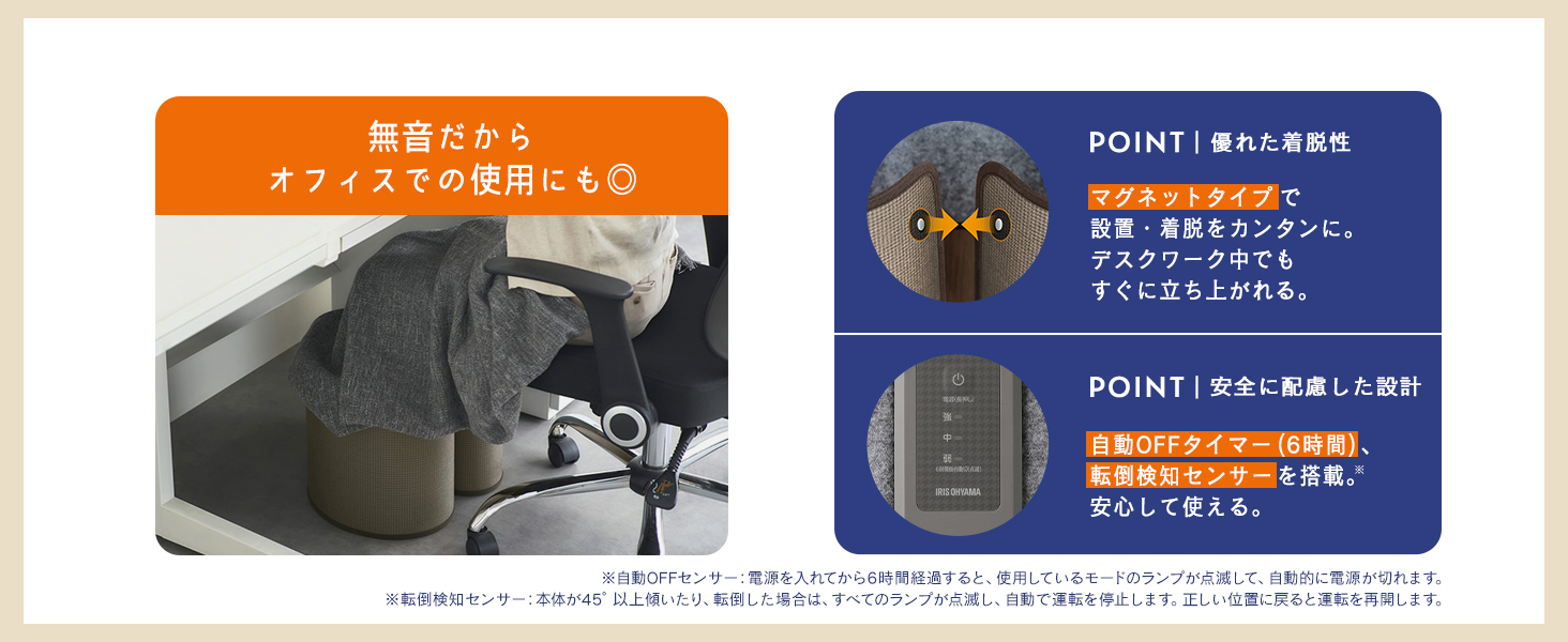 - 転倒時自動オフ:本体が倒れたら自動で電源が切れる。つまずき・地震・コードを引っ掛けた際のリスクを低減します。